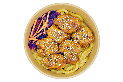 Udon-Nudeln mit Hähnchen-Karaage, Krautsalat, Yakisoba- & Teriyaki-Soße und Sesam
